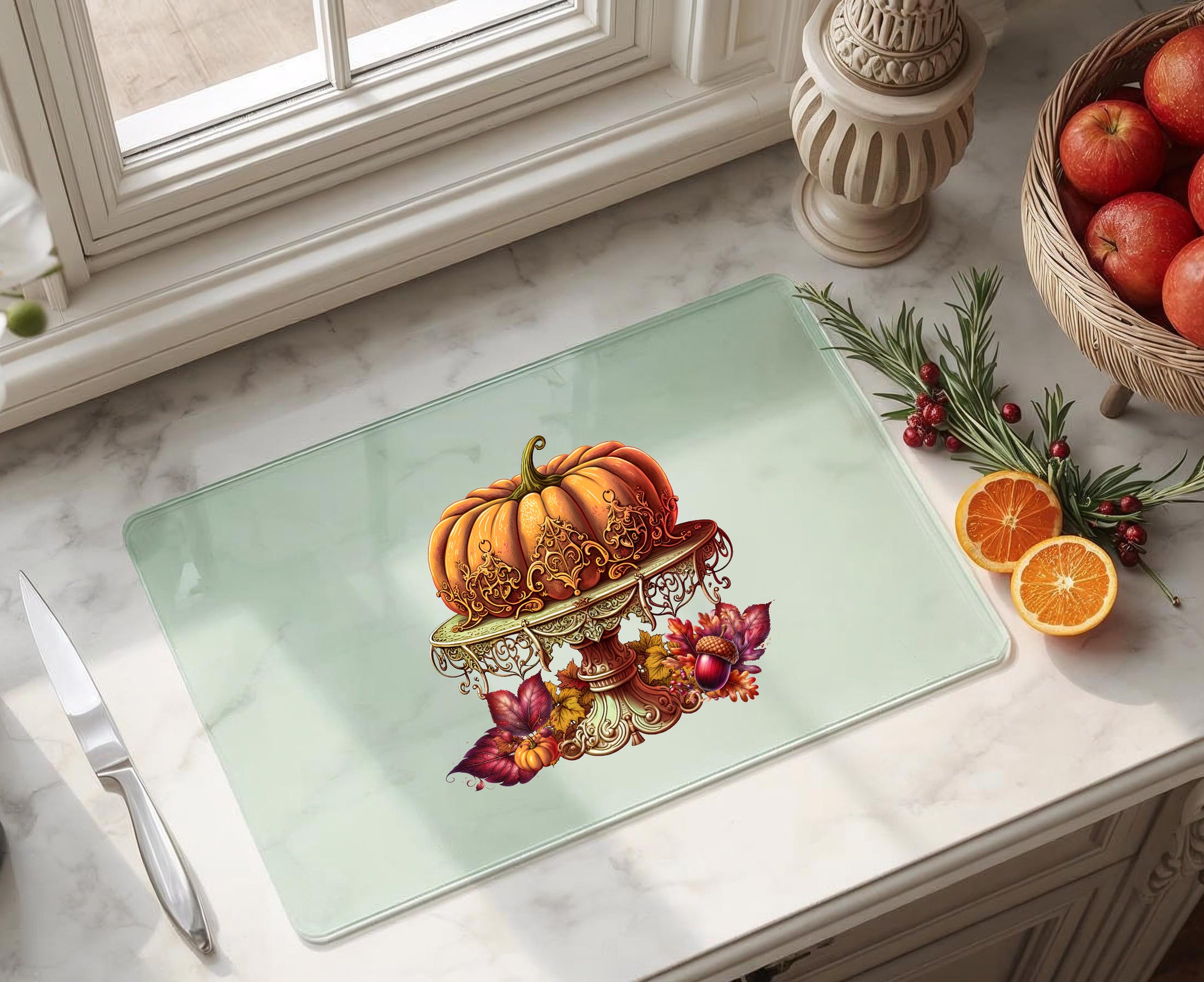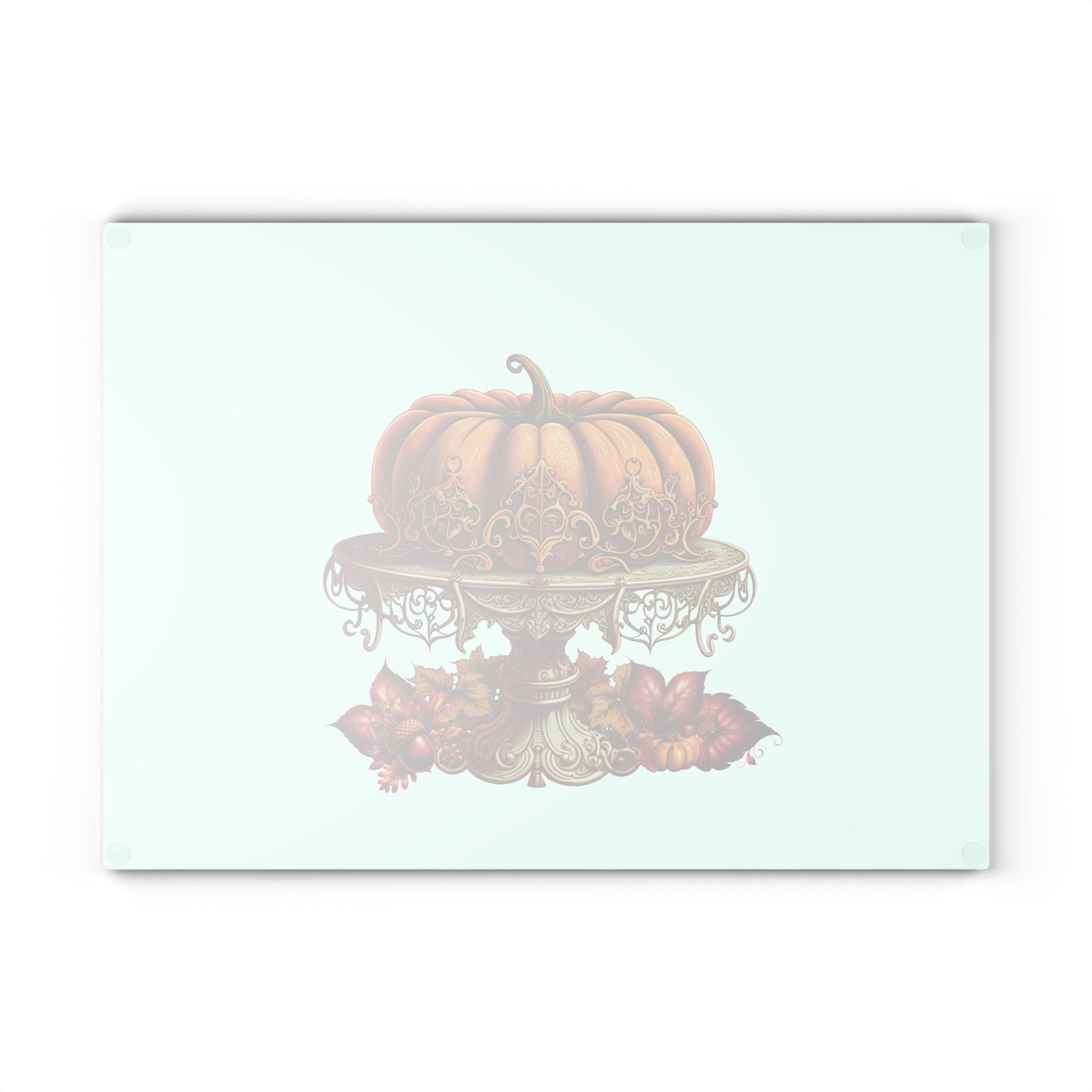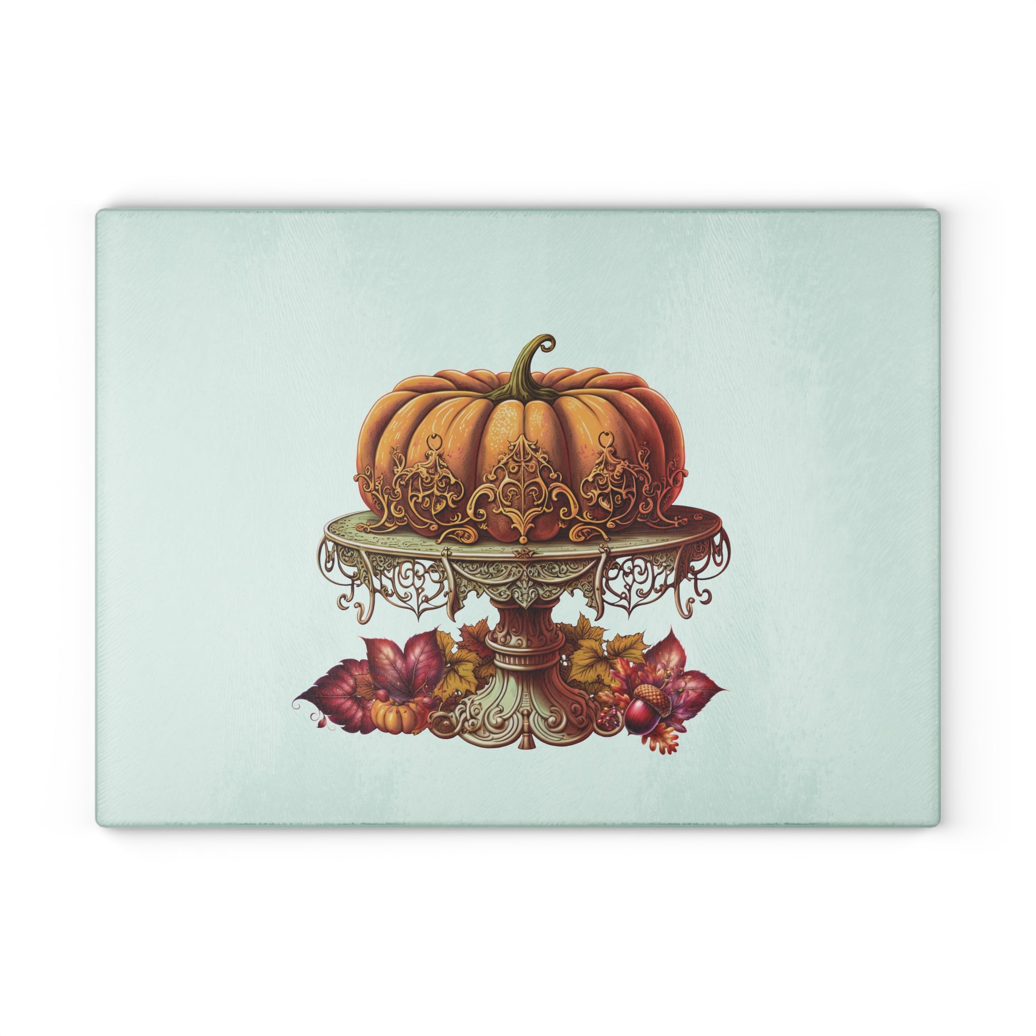 Elevate your autumn kitchen with our elegant Pumpkin on Vintage Gold Cake Stand Glass Cutting Board. A graceful celebration of the season. This exclusive design features a beautifully detailed pumpkin perched atop an ornate gold pedestal stand with a swirled edge base. Surrounding the stand are touches of autumn splendor: golden leaves, maroon and deep orange foliage, a petite pumpkin, and a single acorn. Each detail painted with timeless warmth and sophistication to include in your Halloween or Thanksgiving decorations.
