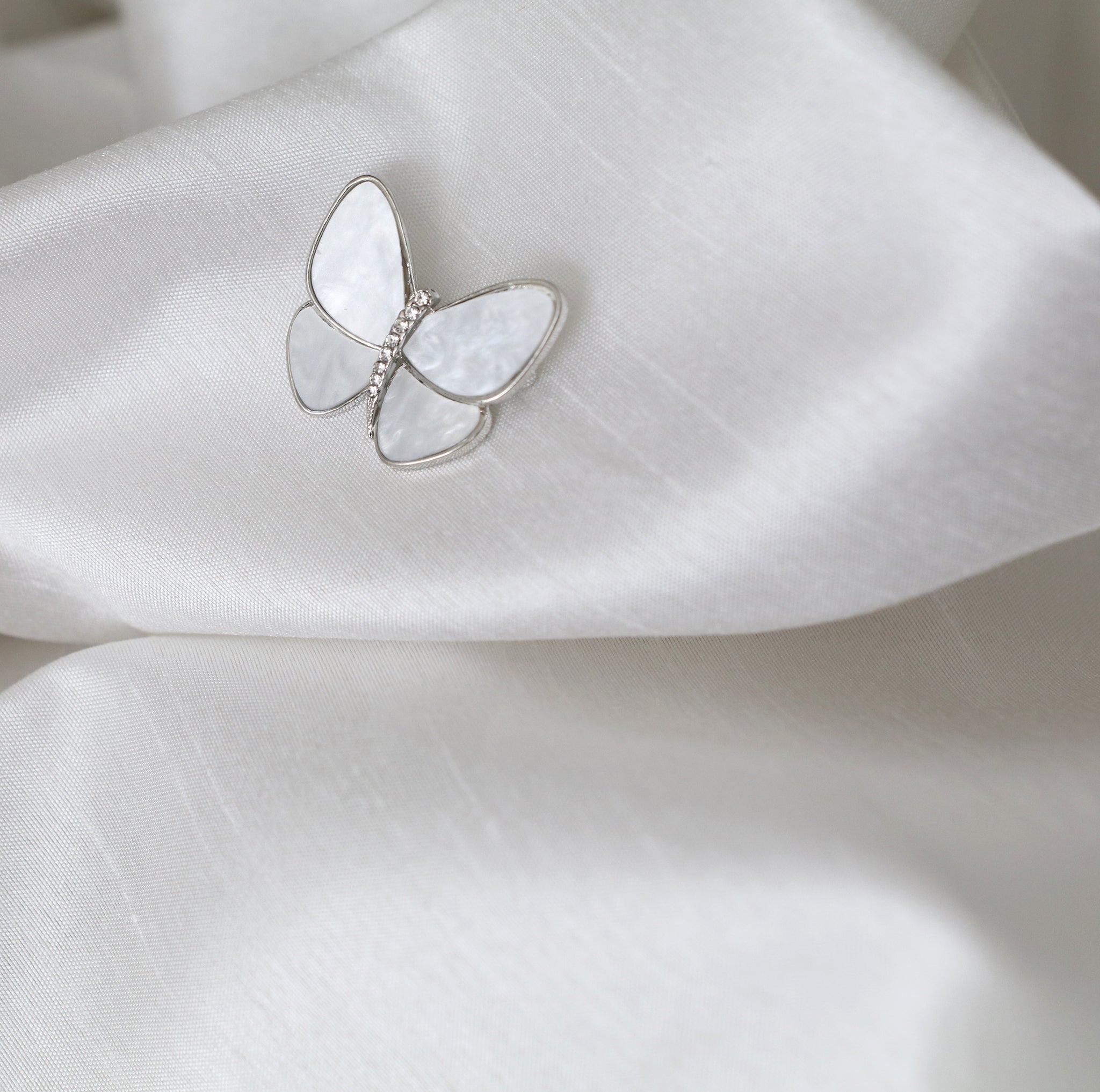 Delicate and timeless, the faux Mother of Pearl shell Butterfly Brooch brings effortless elegance to any wardrobe. With luminous mother of pearl wings framed in gold or silver tone and a single pearl accent on gold tone at the center, this butterfly pin combines grace and sophistication in a design that never goes out of style.