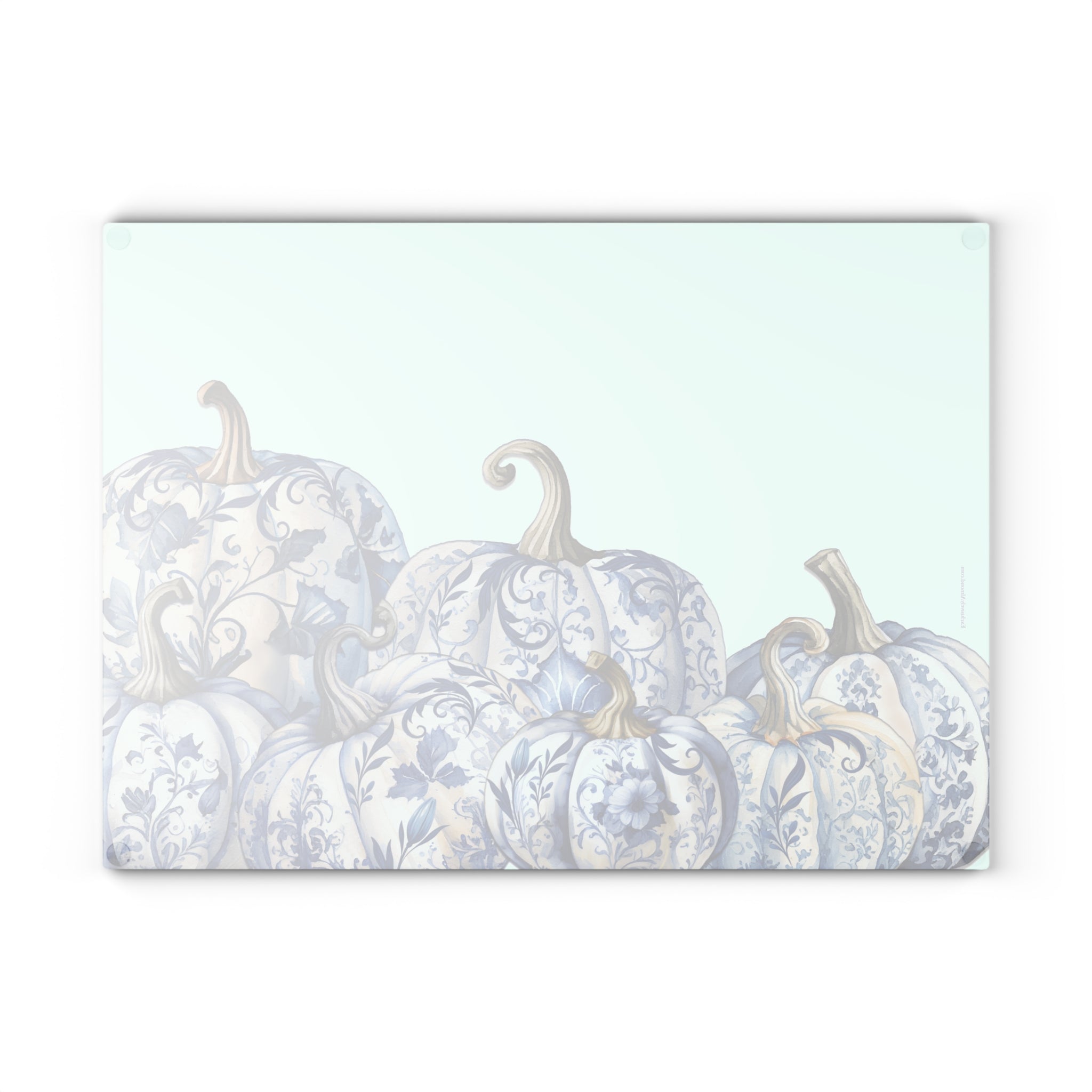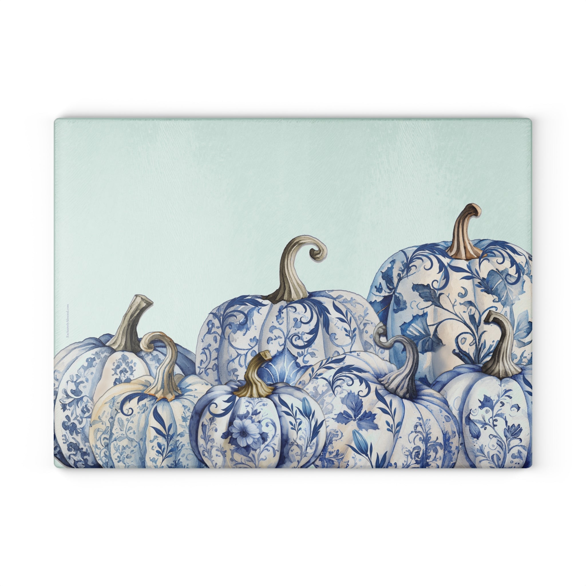Bring the elegance of blue and white Chinoiserie into your autumn kitchen with the Chinoiserie Pumpkins Glass Cutting Board an exclusive Exclusively Almond original. This collectible design blends timeless artistry with seasonal charm, featuring blue and white pumpkins framed by vintage inspired flourishes. Part of a limited fall series, this is the authentic blue and white pumpkin cutting board that began here and cannot be found anywhere else.