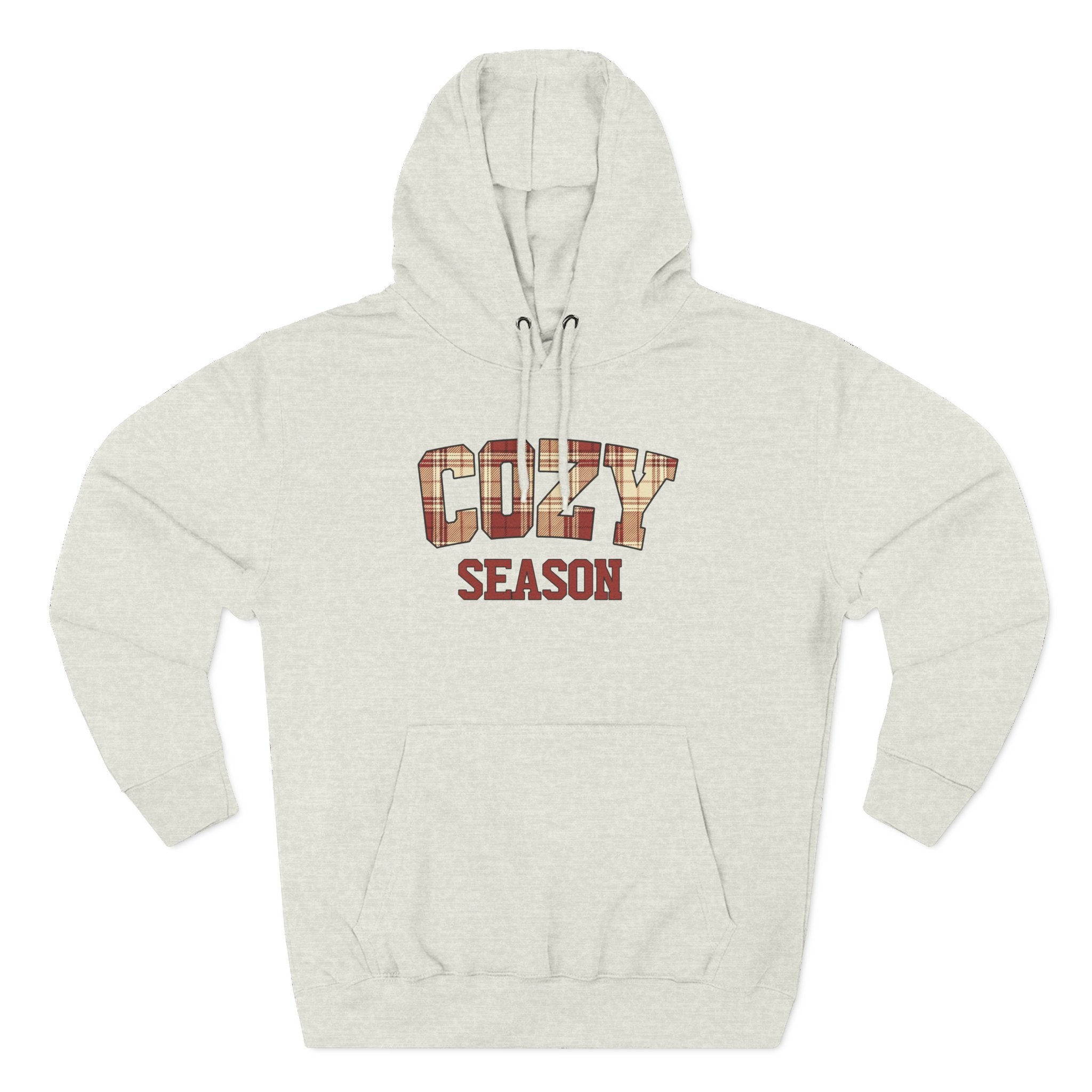 Design: “Cozy” in ivory and burgundy plaid arch; “Season” below in solid burgundy college block letters