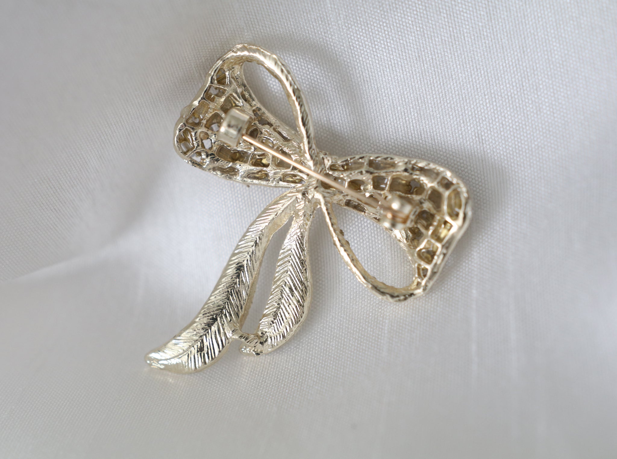 Elegant and festive, this Rhinestone Bow Brooch adds a dazzling finishing touch to any outfit. Crafted in a classic ribbon design, the bow top is set with rectangular rhinestones while the flowing ribbon strands shimmer with round crystals, creating a radiant sparkle from every angle.