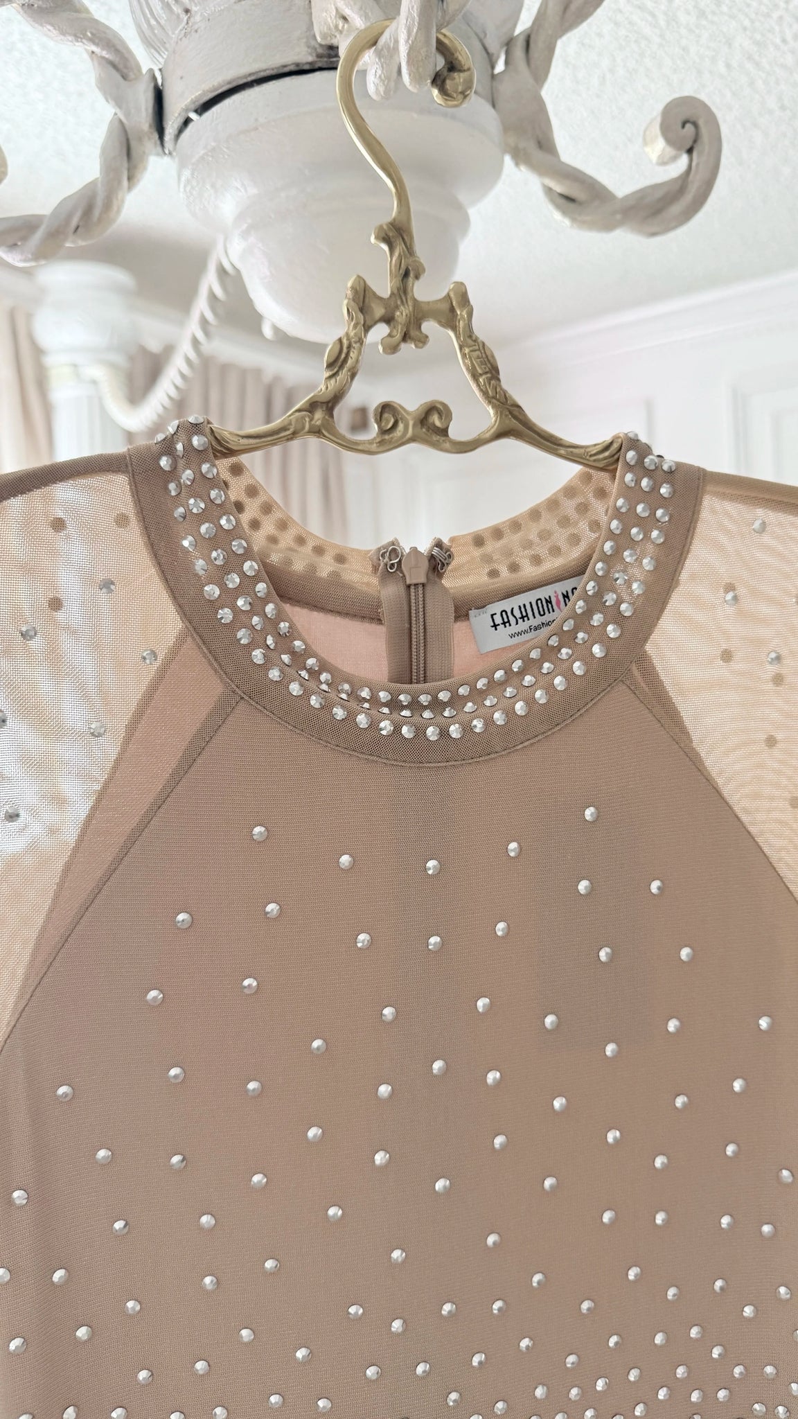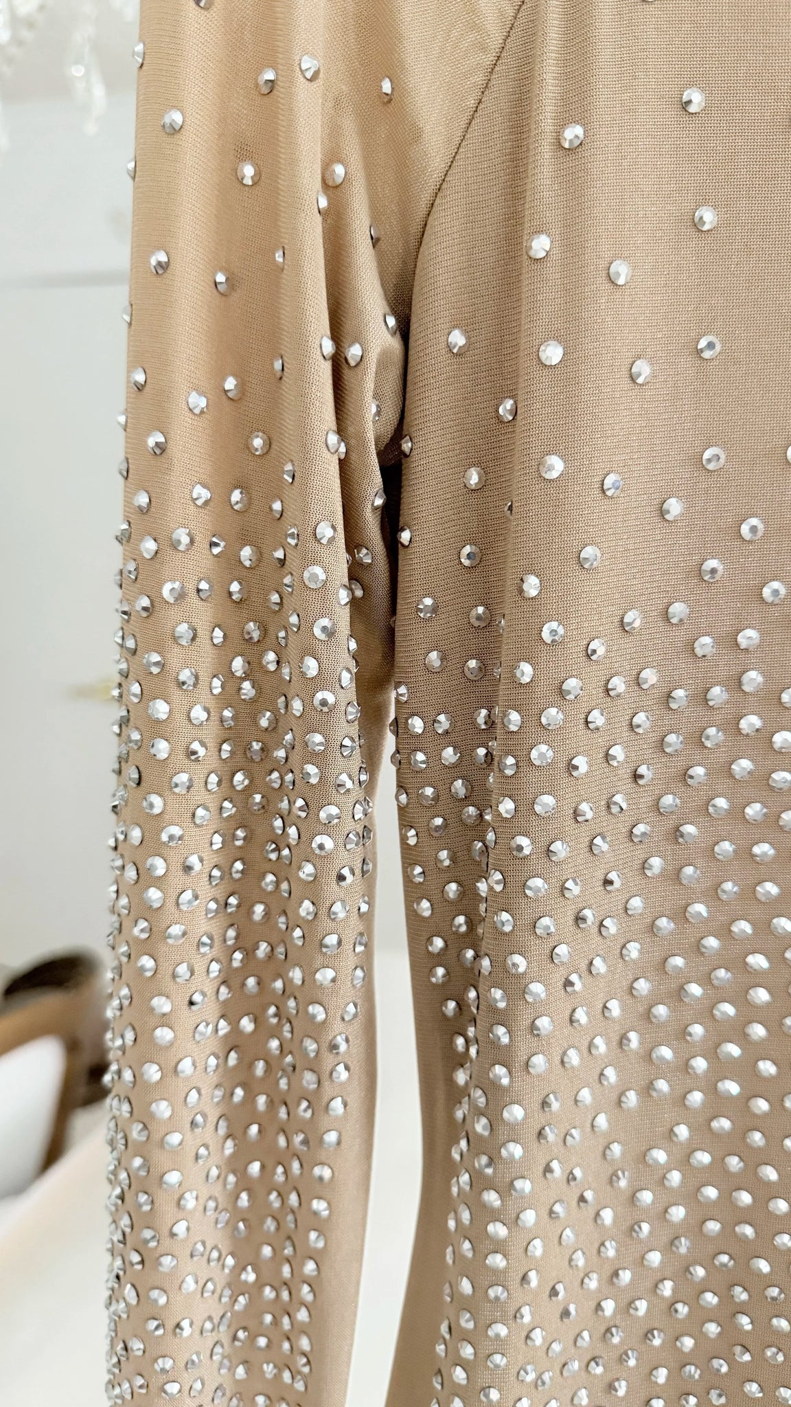 Turn heads in the Dazzle Me Rhinestone Dress from Fashion Nova. Designed in a soft natural latte tone, this form fitting dress features a cascading rhinestone gradient that begins subtly at the neckline and becomes beautifully radiant toward the hem. The sleek, stretchy fabric contours smoothly to the body, creating a flattering silhouette that moves comfortably with you.