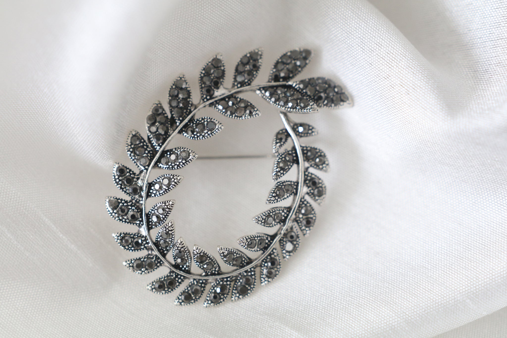 Silver wreath design with detailed leaves and sparkling stones