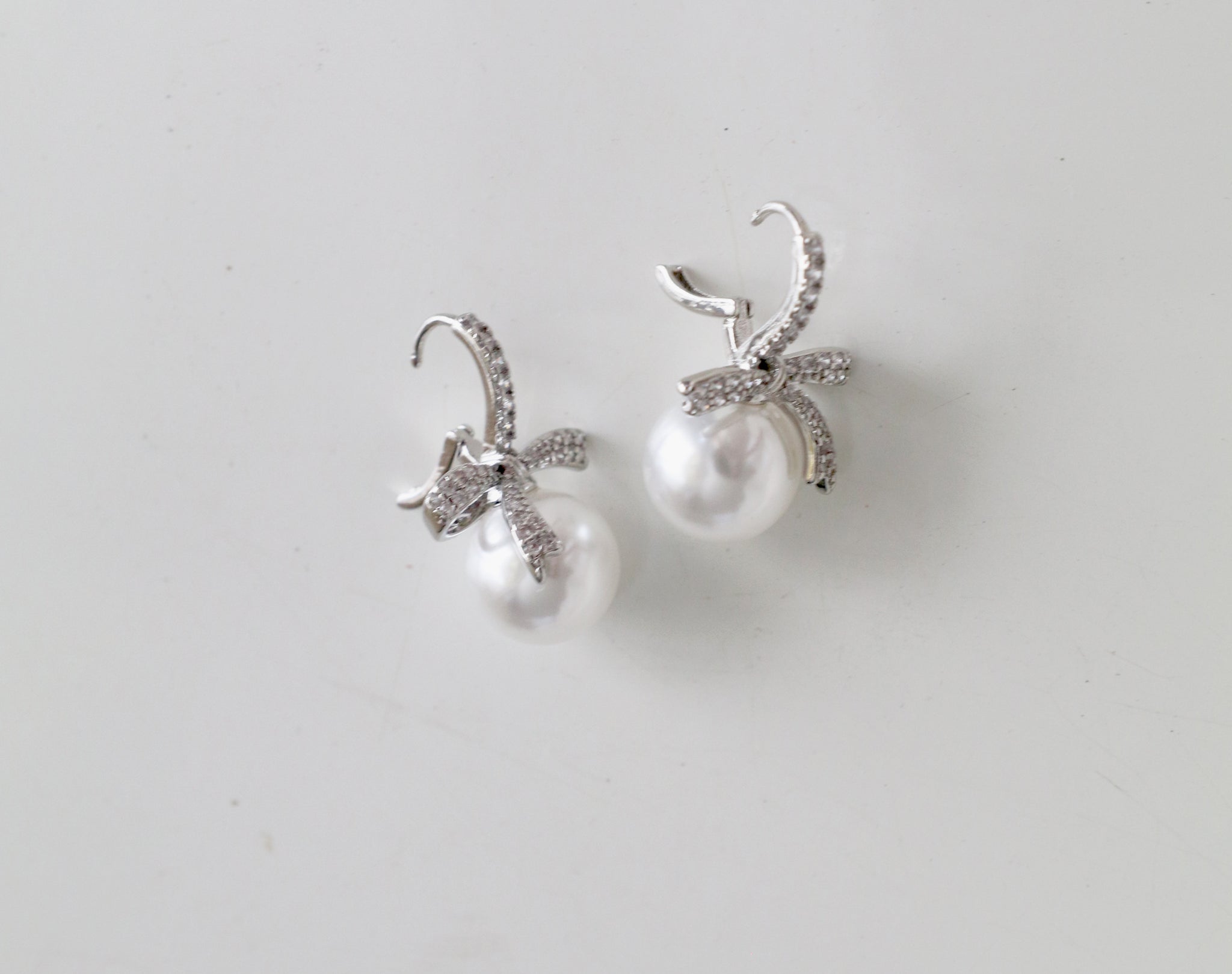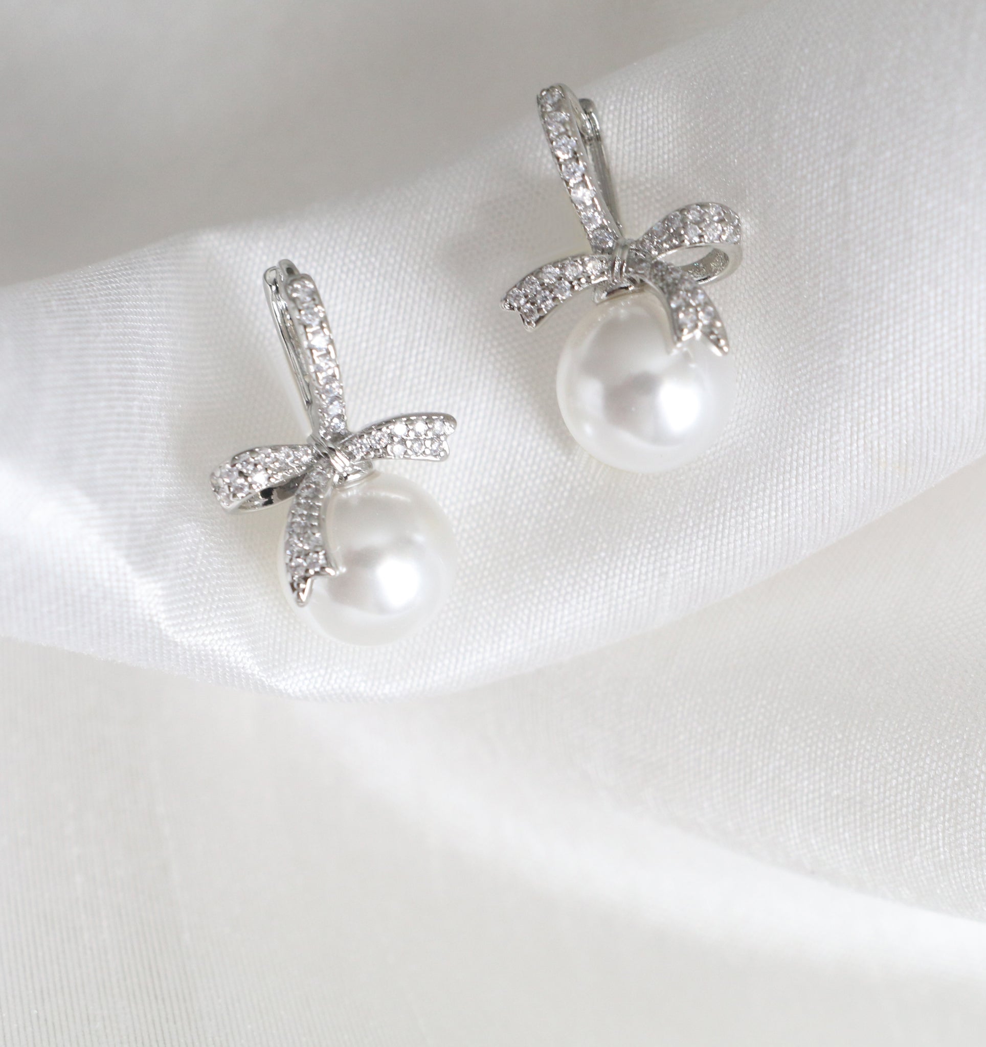 Truly elegant and beautifully detailed, the Sterling Silver Bowknot Pearl Drop Hoop Earrings embody timeless sophistication. Each earring features a finely sculpted silver tone bow encrusted with brilliant zircon rhinestones, gracefully suspending a lustrous pearl drop below. The defined bow shape catches light from every angle, creating a soft yet radiant sparkle that feels refined and feminine.